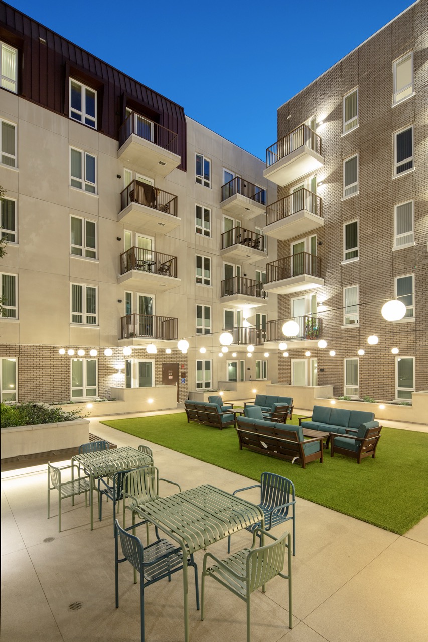 From the community room, residents can access the building’s central courtyard furnished with barbeques, seating and dining areas, and festoon lighting. The courtyard then flows seamlessly into the adjacent public paseo that has been redeveloped by Meta as part of the project to improve pedestrian circulation and be an open space for the surrounding neighborhood.